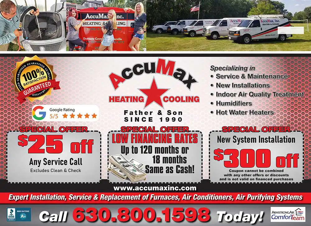Contact AccuMax for your furnace and heating, air conditioning, and water heater installation, maintenance, and repair in the western Chicago suburbs